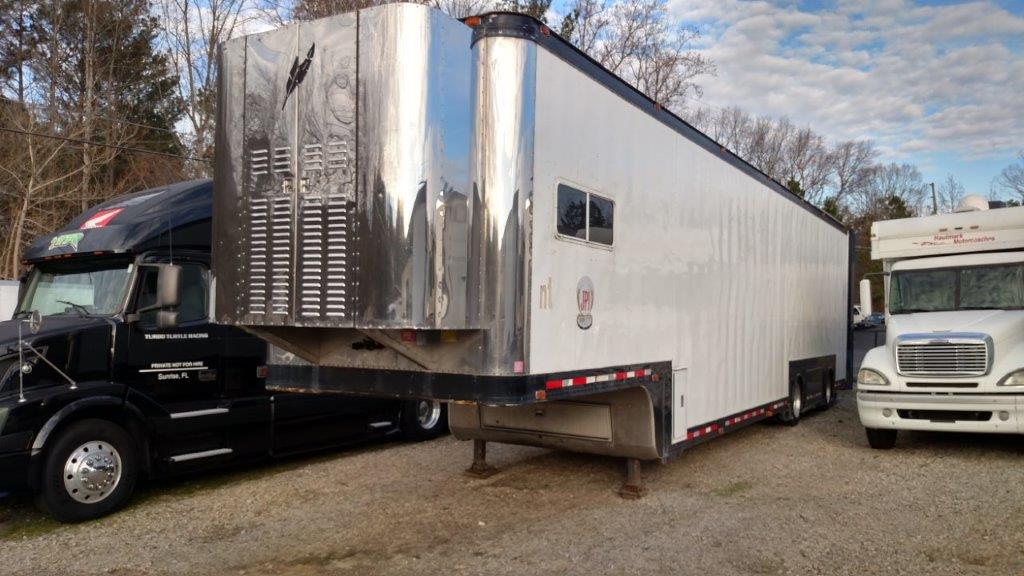 1995 50' Featherlite Liftgate 3-4 car transporter, Screw type liftgate, Extra tall upper deck, Spread axle, Nice lounge area with A/C, Kohler 20kw Generator, Air Compressor, Roll up rear door inside liftgate door, Awning mounts, Exterior lights, Observation deck. Overall in good condition, great foundation to build out the way you want or use as it is. Does have decal markings from removed decals but is wrap ready.