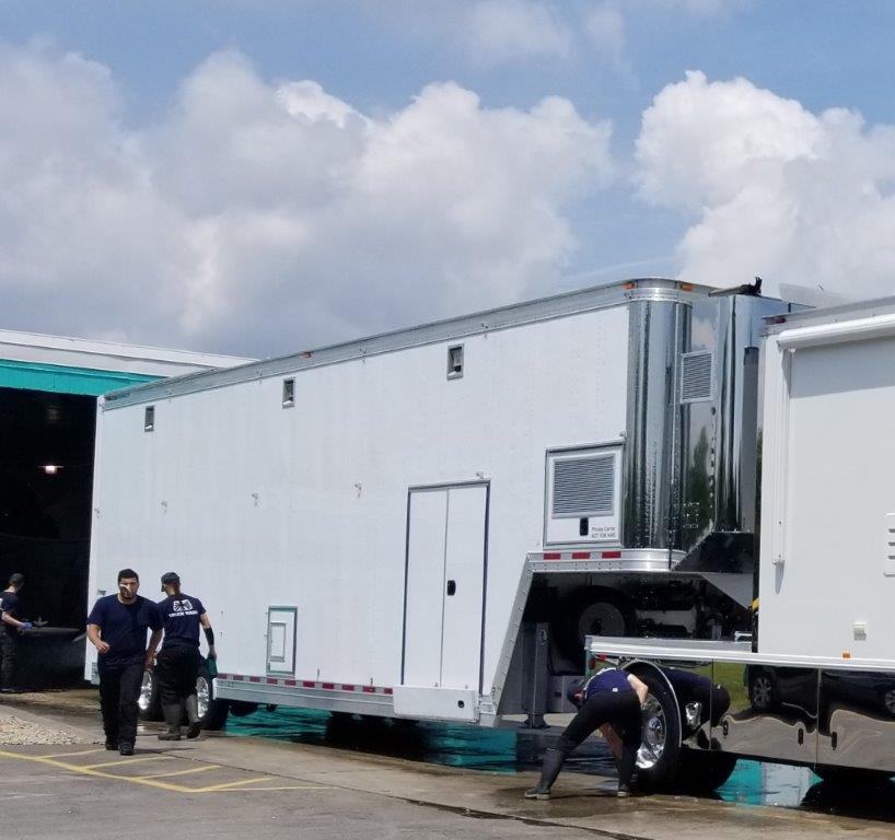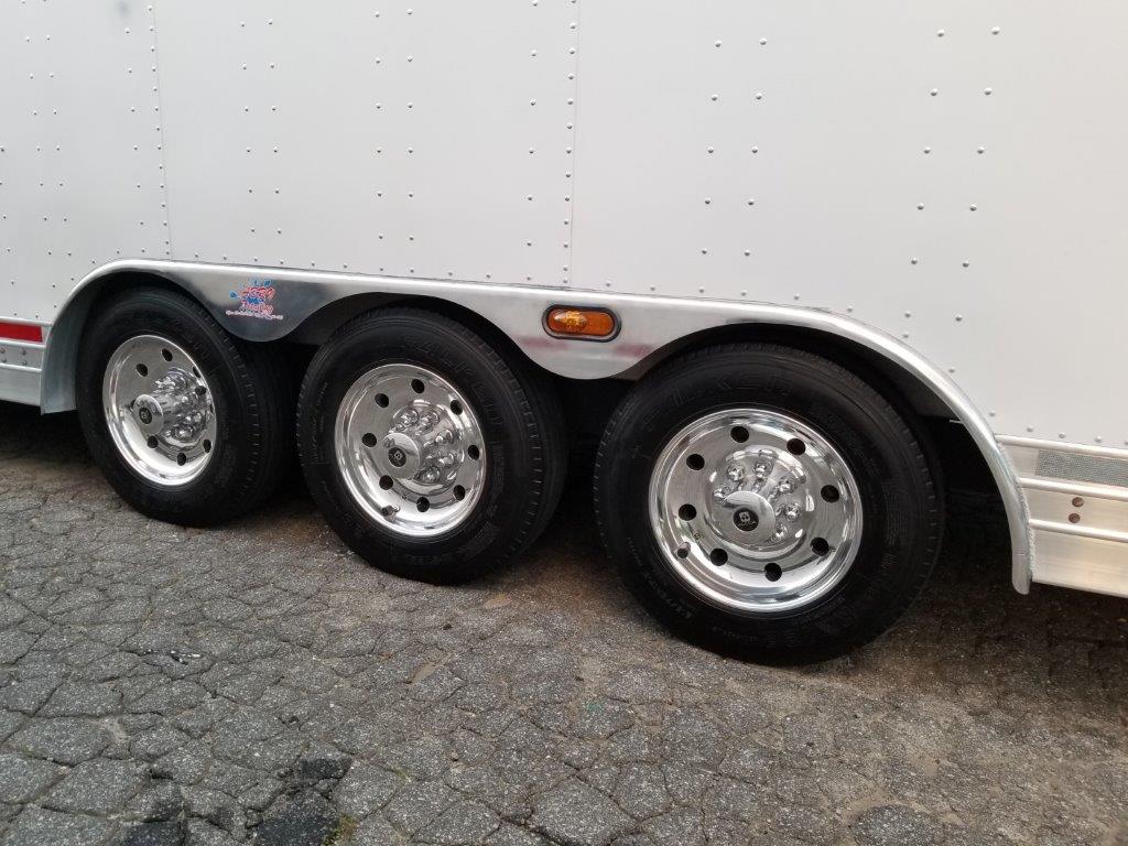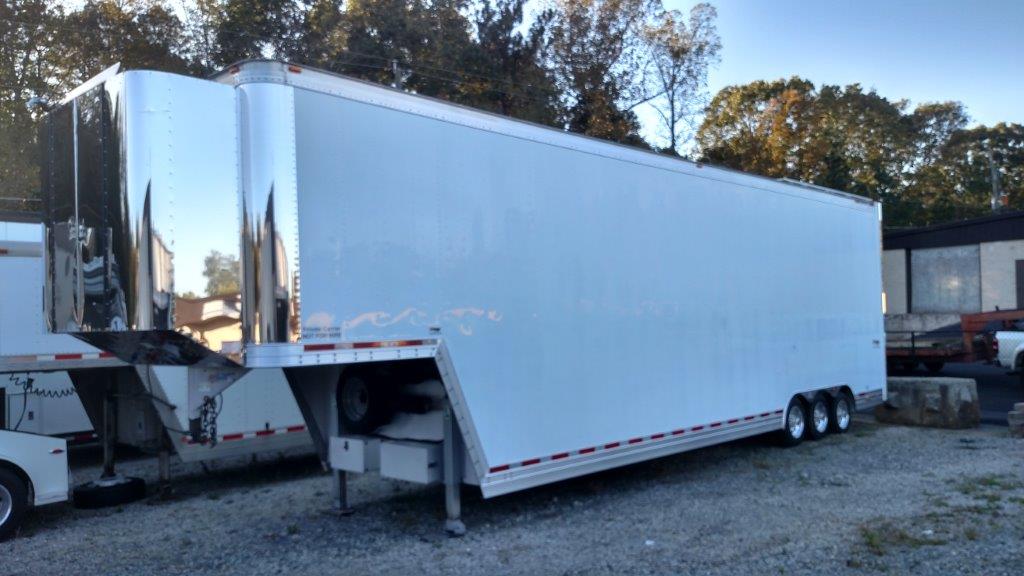 2006 42' Featherlite, Easily holds 3 cars. (2 up and 1 down), Screw type lift gate, Air Ride, Air over Hyd brakes, 3 8000lbs axles, 17.5" Alcoa Aluminum wheels, Spare tire, 16'x45' cantilevered awning, Quarts Right side Lights, Fully finished interior with nice cabinets, Lots of 110 ligths and receptacles, Tire rack, Rubber coin floor with rubber tile protective covering, Double man door with fold down step, 20KW Onan generator with 50 gal fuel tank, A/C, Built in air compressor with lines, Radio, Hyd Landing Gear, Currently has a fifth wheel king pin but can be changed to gooseneck hitch, Extremely clean and well cared for